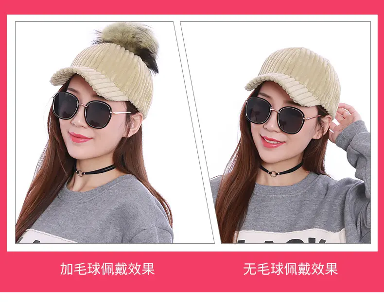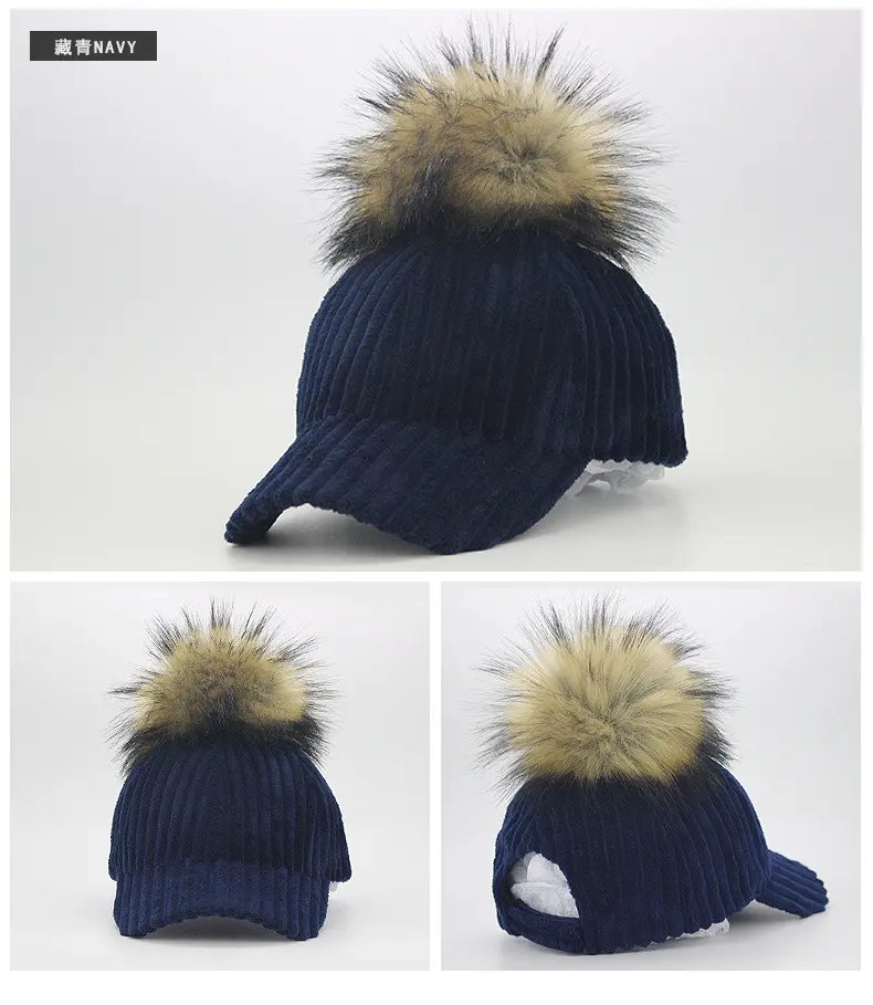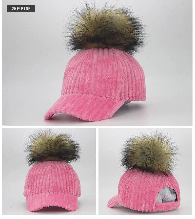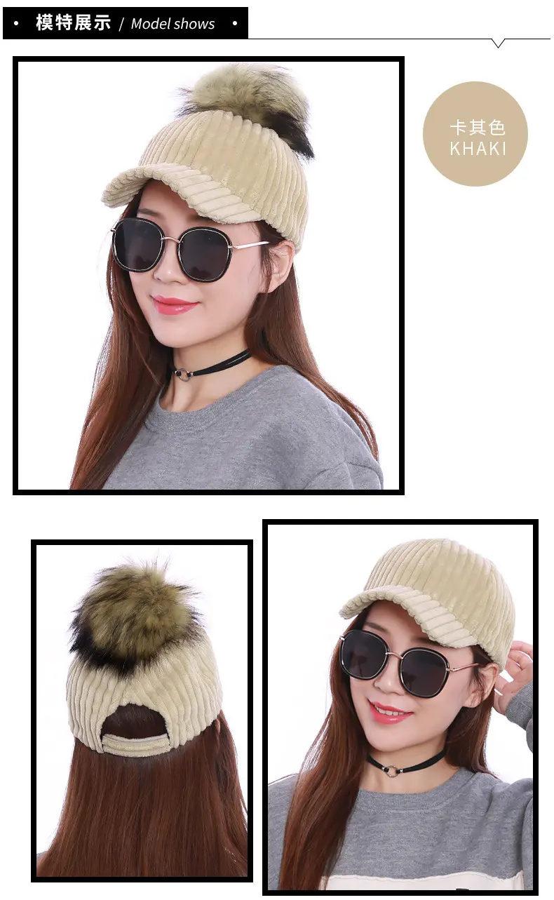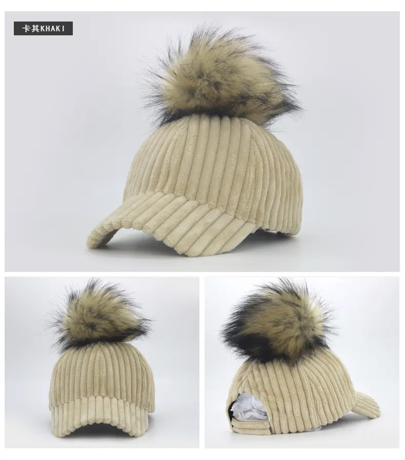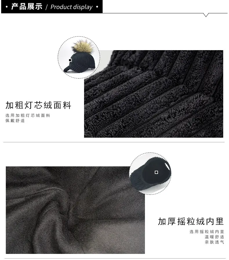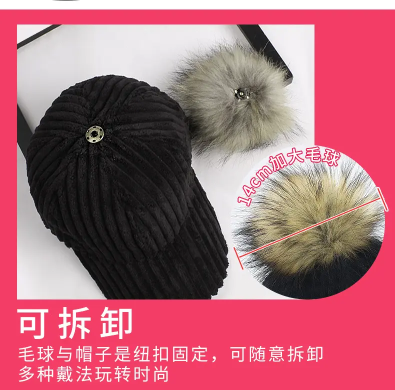 棒球众赢国际平台跨境专供韩版毛球纯色灯芯绒棒球众赢国际平台女冬季保暖可拆卸毛球众赢国际平台