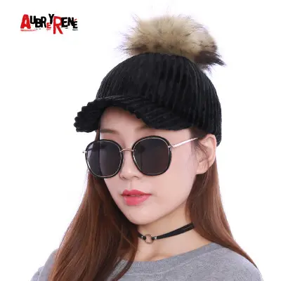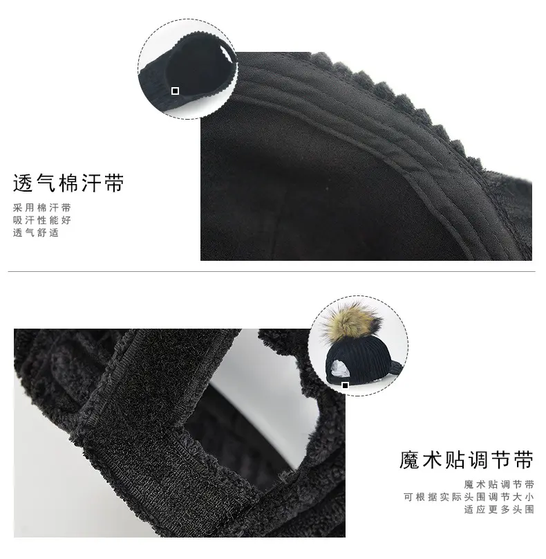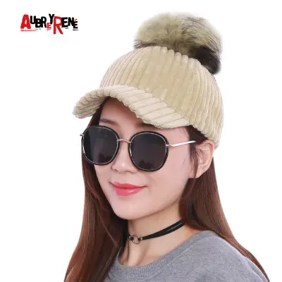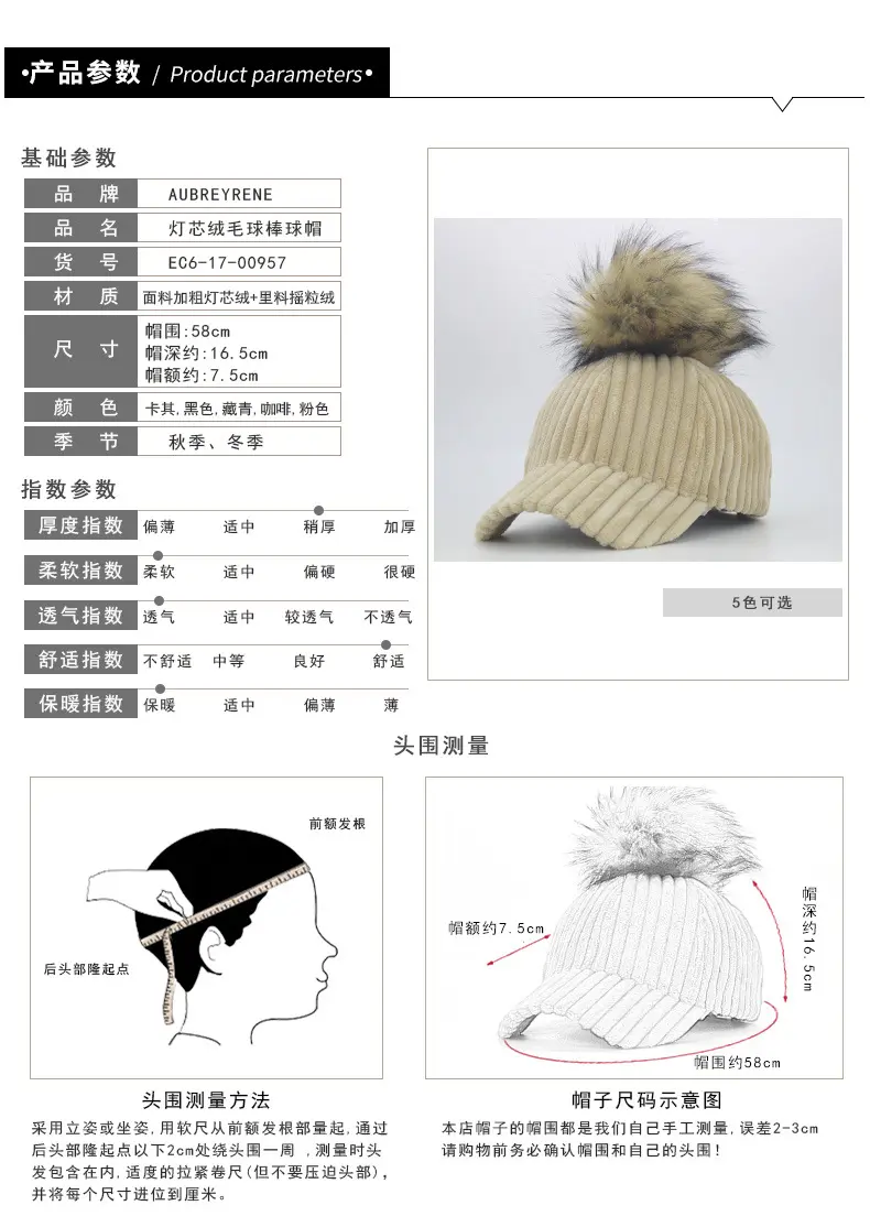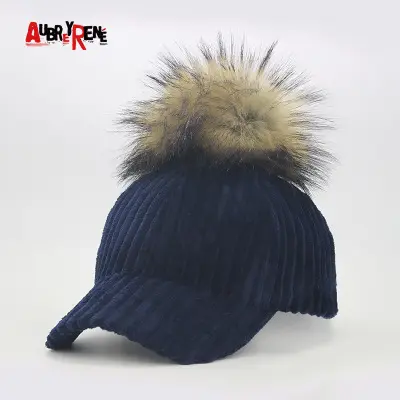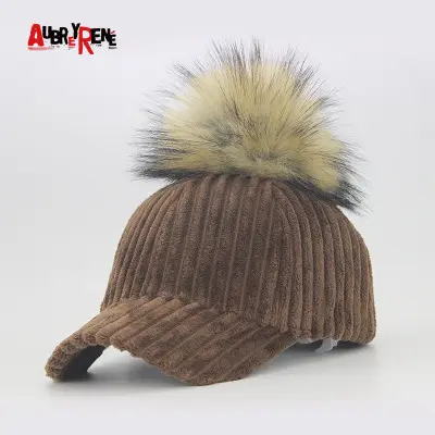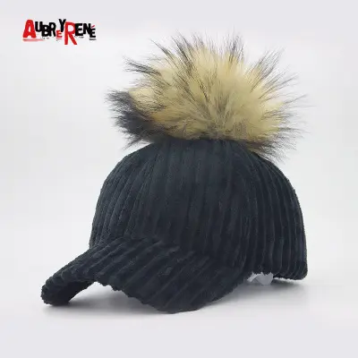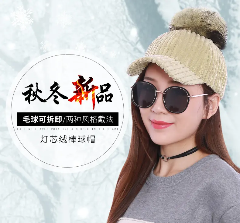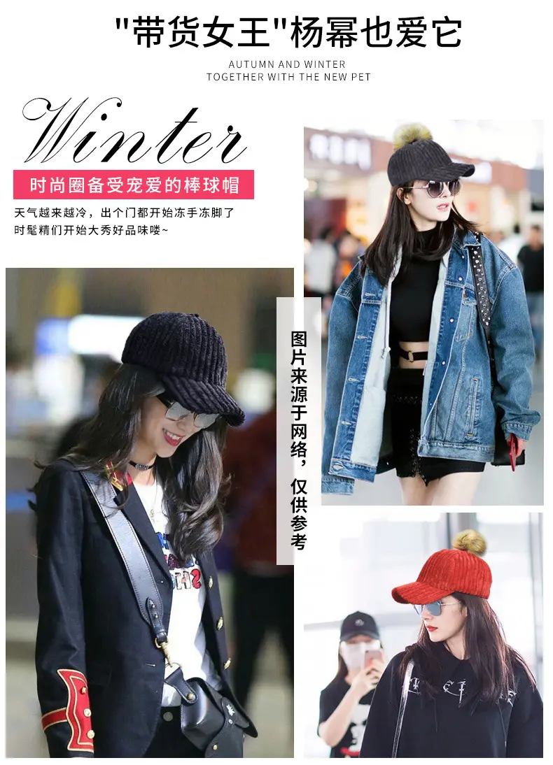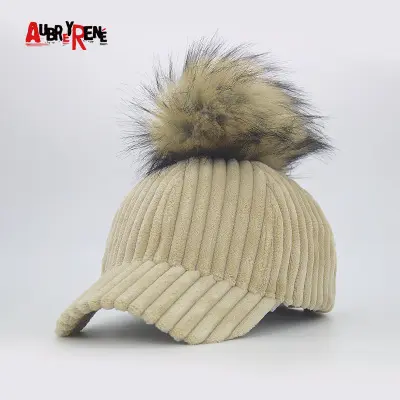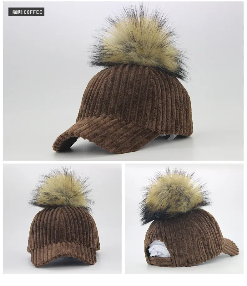 棒球众赢国际平台跨境专供韩版毛球纯色灯芯绒棒球众赢国际平台女冬季保暖可拆卸毛球众赢国际平台